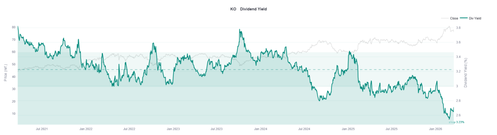 This doesn’t mean KO will definitely drop to $62 soon, or at all. It simply means that historically, periods when the yield was near that level showed significantly better average returns. All figures are historical data — not a prediction or guarantee.
