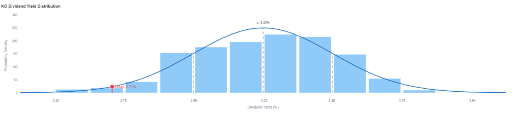 The answer from the distribution chart is striking: KO’s average yield over the past 5 years is 3.23%. Today’s 2.71% sits at just the 2.4th percentile — meaning that over the past 5 years, KO’s yield has been higher than it is today 97.6% of the time.