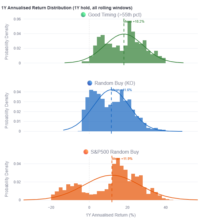 When you hold KO during Good Timing periods (yield above 55th percentile), the historical average 1-year return is +18.18%, with a historical outperformance rate of 69%. Compare that to randomly buying at any time: +11.60% average. The Sharpe ratio tells the same story: 1.40 for good timing vs 0.80 for random. (Historical data, not a guarantee of future results.)