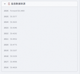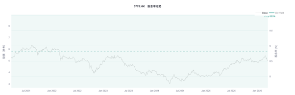 從 Yieldspot 左側的股息數據欄可以直接看到 0778 每年的派息紀錄:2016年 $0.4828、2017年 $0.4998、2018年 $0.5159……到 2020年 $0.4775、2021年 $0.4952、2022年 $0.4292、2023年 $0.4346、2024年 $0.3625、2025年 $0.3577,而 2026年預測更只有 $0.3400。