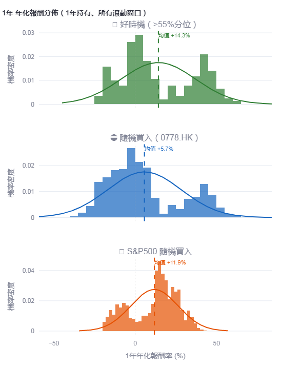 當然,很多投資者會相信自己眼光獨到,先賺股息,等股價彈上就可以價息兼收。所以,這個操作能夠有多少回報呢?Yieldspot 還有一個功能:直接比較「好時機」vs「隨機買入」的歷史報酬。0778 的數據顯示:1年持有期下,好時機進場(>55% 分位)的平均年化報酬是 +11.47%,而隨機買入只有 +2.98%,相差 8.49 個百分點。3年持有期下,好時機進場平均 +6.76%,隨機買入卻是 -1.62%,即隨便買平均是虧錢的。